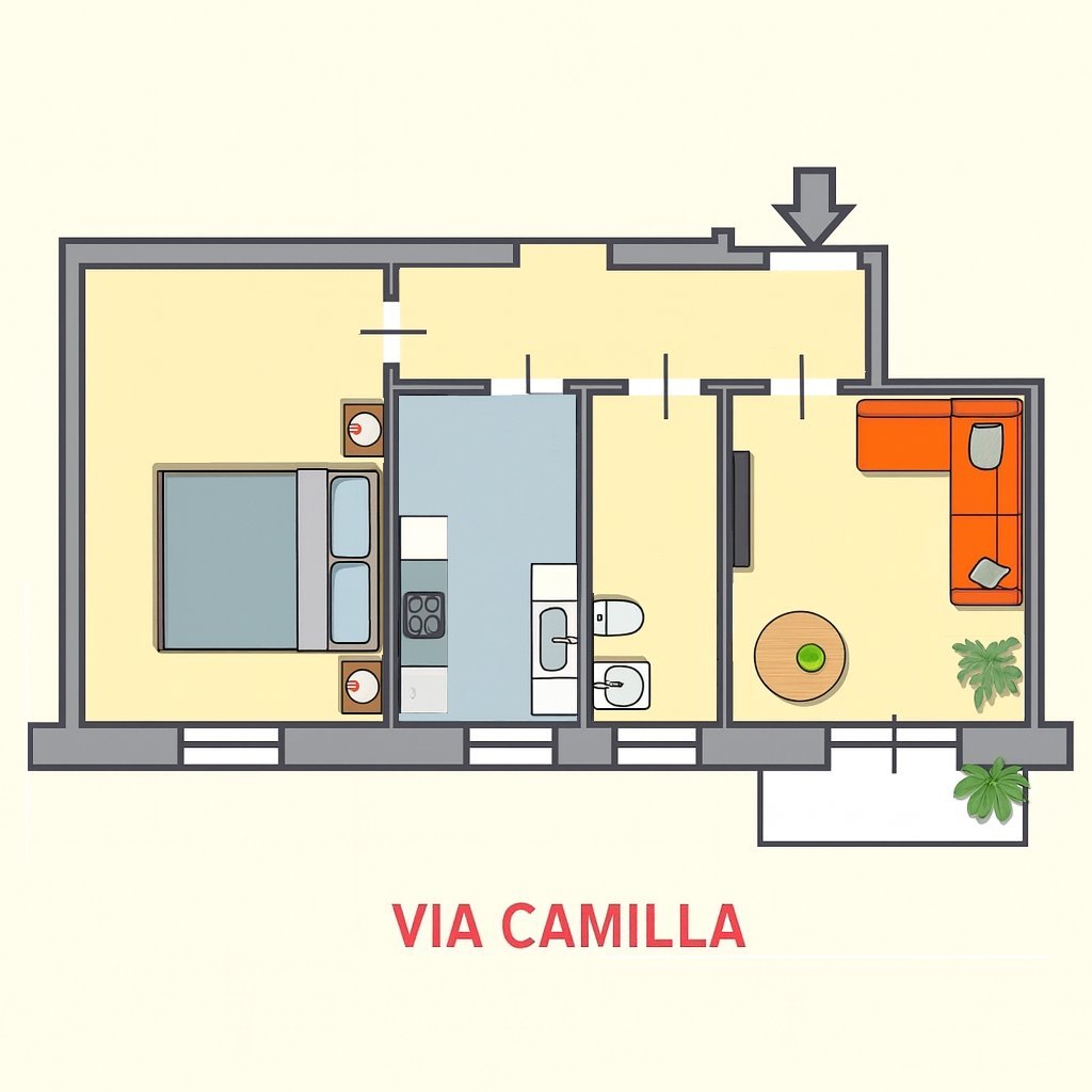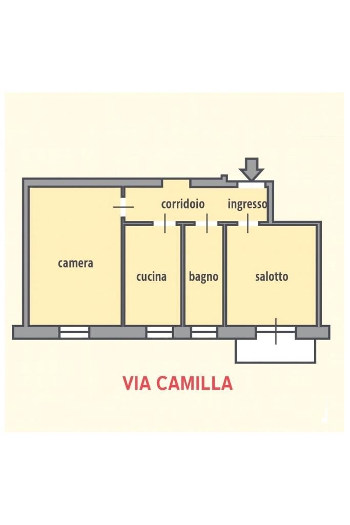 In via Camilla proponiamo, all'interno di uno stabile di sei piani con ascensore, un appartamento posto al quinto piano e composto da ingresso, salotto, cucina, camera da letto, bagno e balconcino.